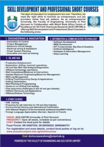Price Details: Basic: N100,000. Advanced: N250,000 Duration: 40 Contact Hours Contact Address/Email: +234 (0) 8169558835, +234 (0) 8134967535, shortcourseacecefor-eng@aceceforuniport.edu.ng